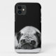 Schwarzweiss-Fotografie eines sehr entzückenden kleinen Mops mit soulful braunen Augen.