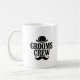 Tanke dich für den großen Tag mit diesem stilvollen "Grooms Crew"-Kaffeebecher auf! Mit einem eleganten Vintage-Design mit klassischem Bowlerhut und Schnurrbart ist dieser Becher das ultimative Accessoire für die Hochzeitsgesellschaft des Bräutigams.