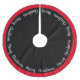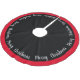 Weihnachtsbaum-Rock Holiday Baum Rock wird in Rot und Schwarz gezeigt, mit silbergrauem Text von Frohen Weihnachten, geschrieben in Drehbuch, den ganzen Weg um den Baumrock mit einem festen Farbrahmen.
