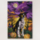 Mit diesem bezaubernden Design, das einen niedlichen Hund in einer Hexe mit geschnitzten Kürbissen schmückt, können Sie das Halloween-Ambiente genießen. Ideal, um Ihren Festlichkeiten eine Touch von spötlichem Charme zu verleihen.