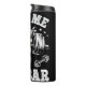 Diese Grafik zeigt einen hart aussehenden Schädel mit einem Bündchen. Ein Grill befindet sich horizontal im Mund, und zwei Knödel flankieren den Schädel. Die Worte "MEET ME AT THE BAR" sind in einem großen, bedrängten, kapitalisierten Schriftart geschrieben, mit einem Kettlebell und Sternen auch im Design enthalten.