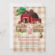Trendy Rustic Country Baby Dusche Einladung mit Barnyard mit landwirtschaftlichen Tieren, rote Scheune und karierten Hintergrund.