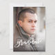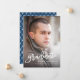 Mit dieser stilvollen Ankündigung des Foto Abschlusses mit dem Wort "Graduate" in einem trendigen Pinselskript in Weiß und einem teilweise transparenten dunklen Farbverlauf für Kontrast verkünden Sie Ihren Abschluss. Die Karte hat ein blaues und weißes Muster auf der Rückseite. Personalisieren Sie es, indem Sie den Platzhalter-Text ersetzen und das Foto für die Auswahl/den Platzhalter durch Ihr eigenes Foto ersetzen. Für weitere Optionen, wie zum Beispiel den Schriftart, die Textgröße/Schriftfarbe oder den Abstand zwischen den Buchstaben zu ändern, klicken Sie auf die Schaltfläche "Anpassen". *Bitte beachten Sie, dass das Zazzle-Wasserzeichen in der Zoomvorschau NICHT auf dem gedruckten Endprodukt © Rosewood and Citrus erscheint