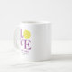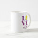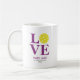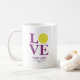 Niedliche persönliche Pickleball-Kaffee-Tasse mit gestapelten Buchstaben, die "LIEBE" buchstabieren, mit einem pickleball Kugel anstelle von O. Personalisierbare Namen und Textzeilen. Erhältlich in einer kuratierten Auswahl von energetischen Farben. Perfekt für den Valentinstag, den süßen Tag, den Hochzeitstag oder jeden Tag!