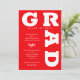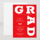 GRAD in fett weißen Schriftzeichen Kurven um die Ränder dieser roten Graduiertenparty Einladungen. SIEHE VOLLSTÄNDIGE SAMMLUNG von Farbtönen, Tellern, Servietten, Hof- und Autozeichen und mehr in unserem Geschäft.