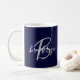 Diese elegante personalisierte Kaffee-Tasse zeichnet sich durch ein Monogramm und einen Vornamen in modernem silbergrauem und weißem Schrift auf marinebasischem Hintergrund aus.