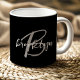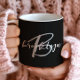 Diese elegante personalisierte Kaffee-Tasse zeichnet sich durch ein Monogramm und einen Vornamen in modernem silbergrauem und weißem Schrift auf schwarzem Hintergrund aus.