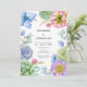 Eine lebendige Hochzeitseinladung in Aquarellfarben mit rosa und violetten Blumen, Sukkulenten und Eukalyptus-Blätter.