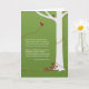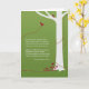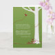 Grüner Hintergrund mit hellen Bäumen, bordeauxfarbenen Vögeln, Mini-Blume und kurvigen Linien. Eine persönliche oder geschäftliche Grußkarte, um Ihr Beileid zu vermitteln.