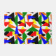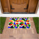Diese Türmatte hat ein Bauhaus-Design aus einer Collage von Dreiecken in Rot, Gelb, Orange, Blau und Grün.