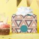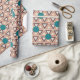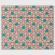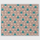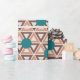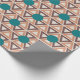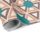 Dieses Umhüllungspapier hat ein geometrisches Design aus wiederholt braun-bräunlichen Dreiecken mit türkisfarbenen Kreisen oben auf einem weißlichen Feld.