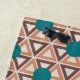 Dieses Strandtuch hat eine geometrische Form wiederholende braune und bräunliche Dreiecke mit türkisfarbenen Kreisen auf einem weißlichen Feld. Das gleiche Design in verschiedenen Farben gewollt? Nachricht.