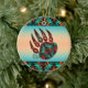 Personalisieren Sie dieses "One of a Kind" Tribal Bären Paw Weihnachtsschmuck! Es verfügt über eine amerikanische Stammbärenpaw auf einem türkisfarbenen und orangen Sonnenuntergang ...umgeben von türkisfarbenen, orangen und schwarzen Grenzen! Original Art Design von Künstler Kerry Miller.