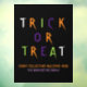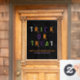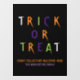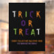 Trick oder gönnen bunt leckere Typografie Halloween lustige Halloween Dekorationszeichen, Fensterklammern, Dekorieren. Orange, grüne, lila, weiße, farbige Typografie, schwarzer Hintergrund. Anpassbarer Text und Familienname am unteren Rand des Zeichens.