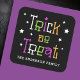 Viereckige Halloween-Aufkleber mit dem Text: "Trick or treat" in weißen, orangefarbenen und lila Buchstaben, umgeben von Sternen. Alle Farben sind im Designwerkzeug anpassbar. Verwendung als Umschlag Aufkleber, Aufkleber für Geschenke und Gefälligkeiten, Produktverpackung, Handwerk und Scrapbooking usw.