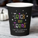 Halloween-Tassen mit weißen Sternen und dem Text "Trick or treat" in orangen, lila, weißen und grünen, skurrilen und eckigen Buchstaben mit einer benutzerdefinierten Nachricht unten.