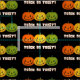 Dieser Stoff hat 3 Jack-o-Laternen, die in einer Reihe mit dem Text "Trick or Treat?" unten sitzen. Die Kürbis sind orange, gold und grün mit einem klaren Hintergrund, sodass Sie eine andere Hintergrundfarbe wählen können. Der weiße Text ist in einer dünnen orangefarbenen Zeile dargestellt, um den Worten mehr Aufsehen zu geben auf einigen Hintergrundfarben.