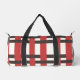Retro woven pattern in three colors. Red and brown lines on an almost white background. Brown areas on the sides offer space for your name, slogan, or motivational quote. Classic colors for your retro-style travel bag.