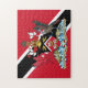 Das Wappen von Trinidad und Tobago wurde von einem 1962 gegründeten Ausschuss entworfen, um die Symbole auszuwählen, die für die Bevölkerung von Trinidad und Tobago repräsentativ sein sollten. Das Wappen der Palmen am oberen Ende des Wappens wurde aus Tobagas Wappen genommen, bevor es in politische Gewerkschaft mit Trinidad einging. Der Schild besteht aus den gleichen Farben (schwarz, rot und weiß) wie die Flagge der Nation und tragen die gleiche Bedeutung. Die Goldschiffe stellen die drei Schiffe dar, die Christoph Kolumbus auf seiner Reise benutzte. Die beiden Vögel auf dem Schild sind Kolibris. Trinidad wird manchmal als das "Land des Hummingvogels" bezeichnet, da auf der Insel 18 verschiedene Kolibri-Arten aufgezeichnet wurden. Auch das "Land des Hummingvogels" gilt als der indische Name für Trinidad. Die beiden größeren Vögel sind die Scarlet Ibis (links) und das Cocrico (rechts), die nationalen Vögel Trinidad und Tobago. Unterhalb der Scarlet Ibis befinden sich drei Hügel, die die Trinity Hills im Süden von Trinidad repräsentieren, von denen man annimmt, dass sie Kolumbus davon überzeugt haben, die Insel nach der Dreifaltigkeit zu benennen. Die Insel, die sich aus den Gewässern unter dem Cocrico erhebt, repräsentiert Tobago. Unter diesen Vögeln steht das Motto der Nation: "Gemeinsam streben, gemeinsam erreichen wir."