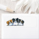 Zeichn von Andie in drei Farbtönen japanischer Hunde: rot/weiß, schwarz/weiß und schwarz/weiß mit braunen Punkten.
