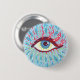 Psychedelischer Augenknopf mit farbenfroher Abbildung eines bizarren blauen Auges mit großen, gekräuselten, rosa Wimpern, überall fließenden hellblauen Tränen und vielen rosa und grünen Elementen - Erweiterungen der Wimpern.
