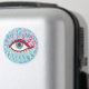 Psychedelischer Augenmagnet mit einer farbigen Abbildung eines bizarren blauen Auges mit großen, gekämmten rosa Wimpern, überall fließenden hellblauen Tränen und vielen rosa und grünen Elementen - Erweiterungen der Wimpern.