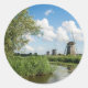 Montage photo rond de trois moulins à vent le long d'un canal avec des bateaux et des roseaux sous un ciel bleu avec des nuages bouffants créant une scène paisible dans la campagne hollandaise de Leidschendam, la Pays-Bas.