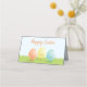 Placer la carte avec trois, souriants, oeufs de Pâques. Les personnages et l'herbe verte sont à la fois à l'avant et à l'arrière de la carte de place. L'arrière de cette carte d'endroit a des versions plus grandes de l'illustration et des mots. Les mots "Bonne Pâques" sont personnalisables.