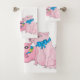 Faites passer votre temps de bain à vos enfants avec ce joli dessin des trois petits cochons en rose avec de grands arcs bleus et un mignon ami d'oiseau jaune.