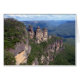 Trois Soeurs, Blue Mountains, NSW, Australie. Les Trois Soeurs est une formation rocheuse dans les Blue Mountains de la Nouvelle-Galles du Sud, Australie. Ils se trouvent à proximité de la ville de Katoomba et sont l'un des sites les plus connus des Blue Mountains, dominant la vallée de Jamison. Leurs noms sont Meehni (922 m), Wimlah (918 m) et Gunnedoo (906 m). Les Soeurs ont été formées par l'érosion. Le grès doux des Blue Mountains est facilement érodé au fil du temps par le vent, la pluie et les rivières, et les falaises entourant la vallée de Jamison sont lentement brisées. Des formations comme les Trois Soeurs sont créées lorsque l'eau s'infiltre dans de petites fissures dans la roche, les élargissant progressivement au fil du temps pour former de grandes indentations. Finalement, les Soeurs seront complètement érodées.