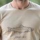 Ein einfacher T - Shirt mit einer Forelle-Illustration in Line Art und Text-Nachricht unten für ein Jubiläumsgeschenk an einen Fischer, einen Angelführer, einen Fisch-Liebhaber, etc.