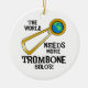 Die Welt braucht mehr Posaunentext mit dem Bild der Erde in der Glocke einer Posaune ist ein lustiges, niedriges Geschenkdesign für Hornmusiker, Schüler und Lehrer in Konzert, Jazz und Marching Band