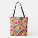 Diese Schultertüte wird mit einem farbenfrohen, tropischen Blumenpalmendesign gezeigt. Mittlere Größe angezeigt. Hat schwarze Gurte. Passen Sie dieses Objekt an oder kaufen Sie, wie es ist. Lizenzierte Printwerbung