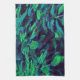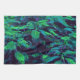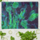 Das abstrakte Stoffmuster von HomeWare auf diesem Küchentuch entstand aus einem Originalfoto eines königlichen Poinciana-Baumes. Einige der tropischen Blätter des Baumes sind in hellem, gelben Grüntöne gehalten. Andere sind im Schatten, in Blautönen von Aqua bis tief aquamarin, mit lila Highlights. Der Hintergrund ist fast schwarz. Das Design hat eine allgemeine Textur.
