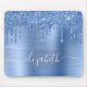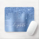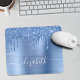 Individuell elegantes und mädchenhaftes Mauspad mit blauen Imitaten Glitzer, das vor einem blauen Imitat mit metallischem Hintergrund tropft. Monogram mit Ihrem Namen in einem stilvollen, trendigen weißen Skript mit Swashes.