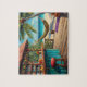 ibrant, colorful illustration depicting a rustic, flower-adorned beach bar next to a palm tree with a striped hammock overlooking a white sand beach and turquoise ocean. Features cocktails on the bar and an acoustic guitar leaning against the tree, evoking a relaxing Caribbean or tropical vacation. Ideal for beach lovers, cocktail enthusiasts, and fans of colorful resort art.