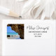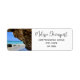 Adressetiketten mit einem landschaftlichen Naturfoto. Schönes türkisblaues Meer mit einem Sandstrand. Ein großer, brauner Felsen verleiht dem hellblauen Himmel Schatten.