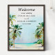 Ce panneau d'accueil mariage d'aquarelle élégant et magnifique dispose d'une plage, d'un ciel bleu et de palmiers. Le texte combine écriture manuscrite et polices sans serif pour un look élégant et moderne. Il est parfait pour une plage d'été ou un mariage de destination tropicale.