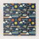 Lebhaftes tropisches Muster mit Sonnen, Wellen, Palmen, Bergen und Segelbooten auf einem dunklen Hintergrund. Ideal für Sommerdesigns.