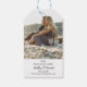 Set mit der Tropical Beach Hochzeit in Urlaubsort Save the Date Geschenkmarke für deine Inselnuptien. Personalisieren Sie es mit den Namen des Ehepaares und dem persönlichen Foto. Diese Strandschilder zeigen ein malerisches Naturfoto mit türkisblauem Wasser und Wellen, die an einem Sandstrand mit weißen Palmen an der Ecke brechen.