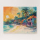Ein John Dyer inspirierte ein tropisches Strandparadies, die untergehende Sonne und Zuhause mit Blick auf das Wasser. Diese Aquarellmalerei ist detailliert, aber minimalistisch.