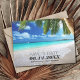 Save the Date Hochzeitskarten für Ihre tropische Hochzeit in Urlaubsort am Strand. Türkisfarbenes Wasser, weißer Sand und Palmen Design speichern Sie die Dattelkarten mit Ihren Hochzeitsdetails angepasst werden.