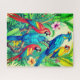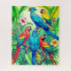 Puzzle in vividly colored tropical birds surrounded by lush green foliage and vibrant flowers. The birds display brilliant shades of red, blue, yellow, and green. The scene depicts exotic beauty and rich botanical detail.