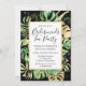 Diese elegante Party Einladung aus tropischen Brautmädchen mit grünen und goldenen Palmen, Philodendron und Farn-Blätter auf schwarzem Hintergrund. Ein eleganter Goldrahmen hebt den schwarzen Text hervor. Gold-Spritzer unterstreichen dieses exotische botanische Design und bringen ein bisschen moderne Laune in die Einladung. Diese Insel-Oase lädt zu jeder Jahreszeit, Strand oder tropische Brautmädchen Tee Party ein.