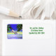 Ein 3D-tropisches Urlaubsbild mit einem niedlichen Delphin, der Weihnachten feiert, indem er einen roten Hut trägt und einen Bonbons zwischen den verzierten Palmen hält. Die individuell anpassbare Beispieladresse ist für Sie bereit, um Ihre eigene Adresse zu ändern.