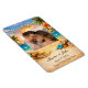 The design is infused with lush tropical elements — from vivid hibiscus and plumeria blooms to playful starfish, coconuts, hats, and swaying palm trees. A golden sunset over turquoise waves sets the scene, while beachside accents add warmth and whimsy.