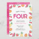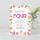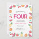 Faites une fête tropicale de 4e (quatrième) anniversaire pour votre petit ! Cette adorable invitation à l'anniversaire rose fruité présente des fruits d'aquarelle dont des ananas, des pastèques, des oranges, des cerises et des fraises. Tous les détails, y compris (sauf l'âge), sont personnalisables. D'autres âges sont également disponibles dans cette collection.