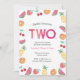 Faites une 2ème (deuxième) fête d'anniversaire tropicale pour votre petit ! Cette adorable invitation à l'anniversaire rose fruité présente des fruits d'aquarelle dont des ananas, des pastèques, des oranges, des cerises et des fraises. Tous les détails, y compris (sauf l'âge), sont personnalisables. D'autres âges sont également disponibles dans cette collection.