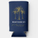 Customize this tropical navy blue and gold can cooler with your own special touch. This elegant design features your family name and reunion date under three artistic golden palm trees.