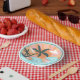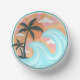 Einfache Teller mit weißem Sand und farbenfroher Retro-Illustration mit grünen Palmen, blauen Wellen, orangefarbener Sonne, gelben und rosa Sonnenstrahlen. Umgeben von Wörtern zu den Sommerzeiten... Waves, Beach Party, Good Vibes, Cocktails, Sommer, Freunde, Lachen, Sonne und Surf. Wirklich coole Teller für den Gebrauch während der Grillen Strand von Hinterhof-Party und auf Lager in Ihrem Patio oder Poolside tiki Bar.